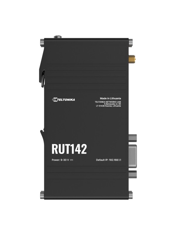 RUT142 to przemysłowy router Ethernet z wbudowanym punktem dostępowym Wi-Fi oraz interfejsem szeregowym RS232, przeznaczony do integracji urządzeń automatyki z siecią IP. Urządzenie nie posiada modemu komórkowego – działa jako router brzegowy (edge router) dla komunikacji lokalnej oraz translacji danych z interfejsów szeregowych do sieci Ethernet/Wi-Fi (tzw. Serial over IP).
