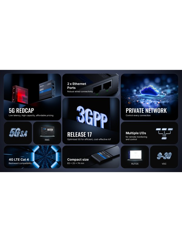 RUT271 to router 5G RedCap zoptymalizowany pod wydajne i energooszczędne zastosowania IoT.